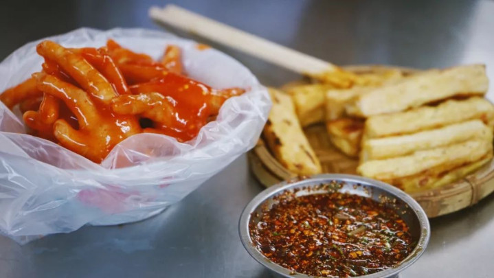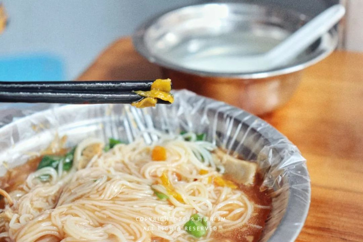 现斩的烧鸭,皮脆肉嫩,一咬一嘴油,猪骨熬制的高汤鲜美醇厚,米粉爽滑入味,再加上自助的小菜,风味更佳。一大早起来嗦一碗粉,连起床气都烟消云散了。