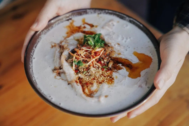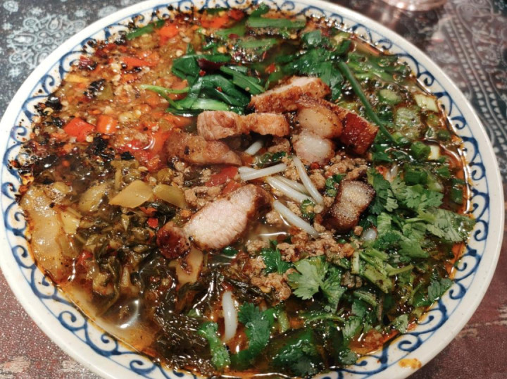 带皮五花肉在炭火炙烤下变得焦香四溢,切成片后与剁碎的番茄和辣椒一同浇在米线上,浓郁的柴火香与醇厚的汤头完美融合,酸辣爽口,吃一次就忘不掉。