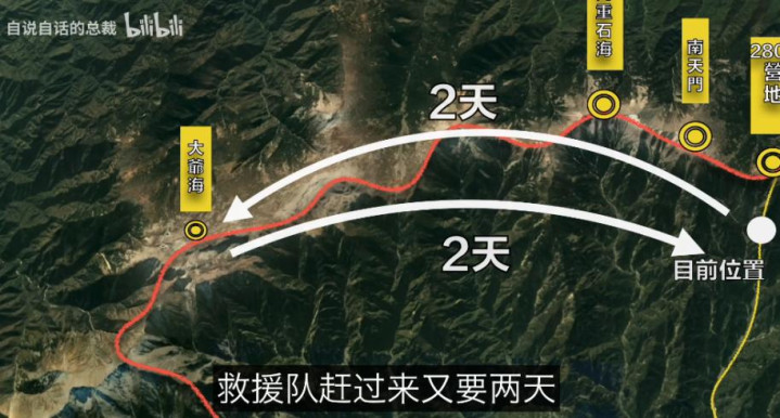 10月7号上午,天气终于好转,小牟意识再耗下去连自己也得栽在这里,于是决定给老吴留下物资,自己带着帐篷赶往大爷海求救。这一来一回至少要4天时间,老吴必须独自撑住。