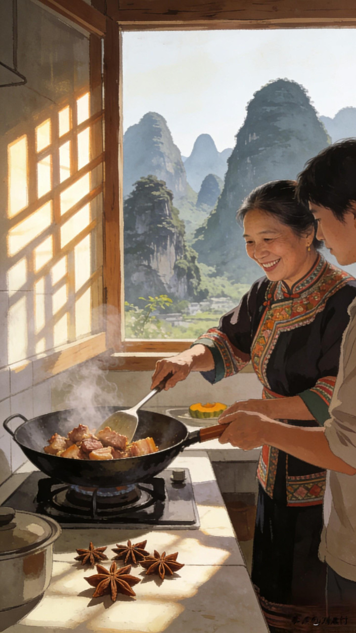 镇子小到半小时能逛遍全程,却处处是惊喜。每天清晨,我被镇口喇叭里的赶集通知唤醒,穿拖鞋下楼,6块钱就能嗦一碗料足味美的壮族牛肉粉,偶尔换口味,就买个越南大姐骑摩托带来的法棍,外酥里嫩裹着酸笋和肉末,配着本地豆浆,便是最地道的边境早餐。房东黄大姐是壮族人,会说三国语言,时常给我送自家晒的八角,教我用越南小南瓜做焖肉,满屋都是烟火香。