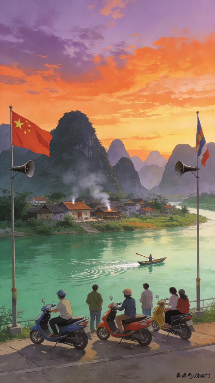 我租的二层小楼月租800块,推开窗就是喀斯特山峰,步行十分钟就能到归春河边。这里没有网红滤镜,只有最真实的生活图景:老人在街边树下下棋,小孩追着土狗跑,越南商贩和本地摊主用半生不熟的双语讨价还价,市集上既有壮家五色糯米饭,也有尼泊尔咖喱和越南咖啡,混搭得格外自然。午后骑着300块一个月租来的电动车闲逛,沿着河边小路前行,河水碧绿如玉,milan对岸越南村庄的炊烟与这边的山峰相映成趣,偶尔能听到两国喇叭交替播放通知,像一场跨越边境的对话。