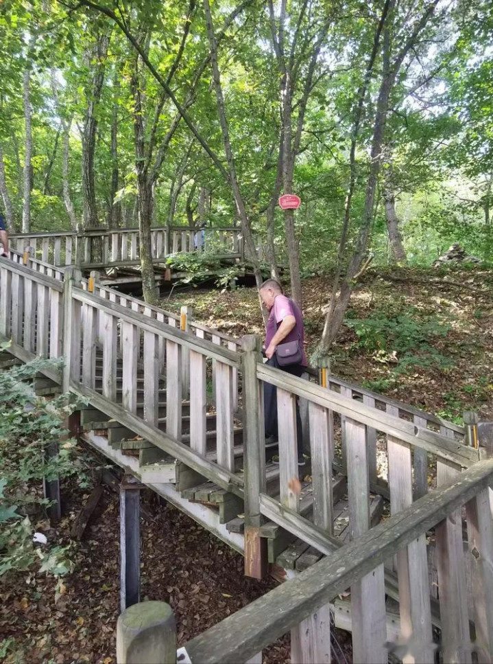 过虎啸雕塑,有登山木栈道,看似有些老旧,实则为本地松木浸泡防腐剂后专门铺设而成,长约3公里,林木夹道,蜿蜒曲折,直达山顶。