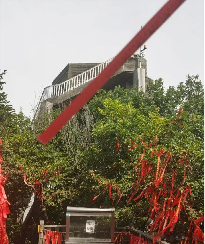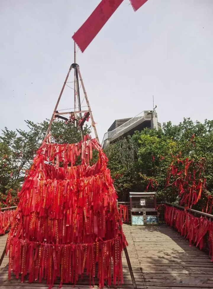 立于山顶之上,为三角形航空标志架,高约3米。登上塔顶,发现不少行人缓步绕行,左三圈右三圈,口中黙念有词,有保佑平安健康之意。