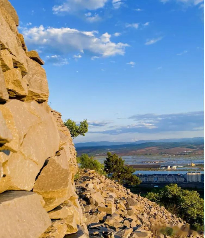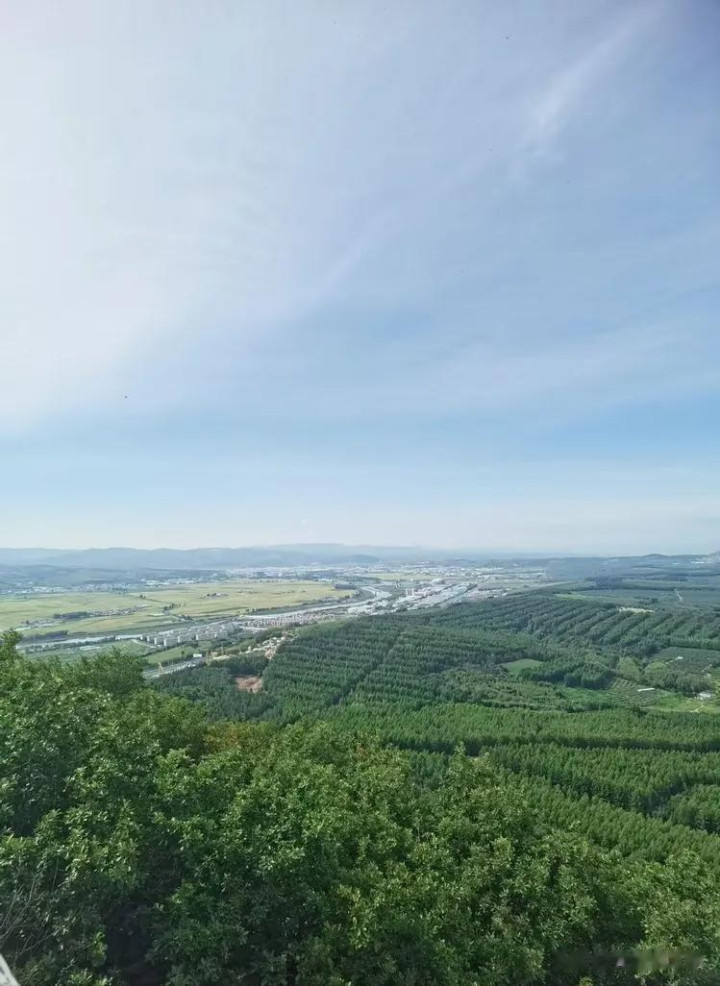 山顶之上,居高临下,北侧为悬崖绝壁,延吉市的城市风貌一览无余;南侧则是一片绿色,山下的布尔哈通河、海兰江及流域的风光尽收眼底。