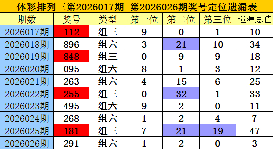 开奖回顾:排列三第2026026期奖号为:291,各位号码遗漏值分别为1、2、0,遗漏总值为3。