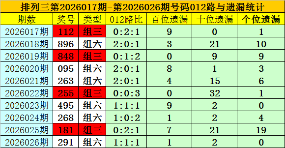 开奖回顾:排列三第2026026期奖号为:291,类型为组六,号码012路比为1:1:1,百十个位号码直选分别遗漏1期、2期和0期。