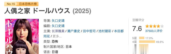 这是她首次出演恐怖片,却凭借并不算高的制作成本,拿下了年度日本恐怖片票房冠军,豆瓣评分稳定在7分以上。