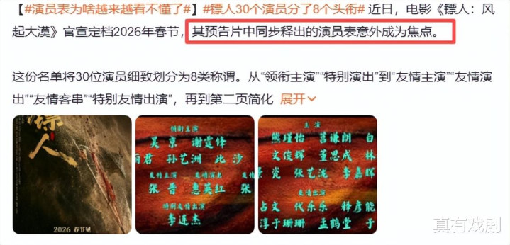 春节档待映的《镖人:风起大漠》因一张“头衔大乱炖”的演员表引发热议。30位演员被划分成8个头衔,从“领衔主演”“核心主演”到“特别出演”“特邀主演”,名号五花八门,看得人眼花缭乱。