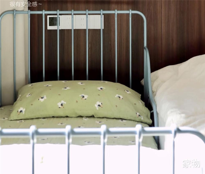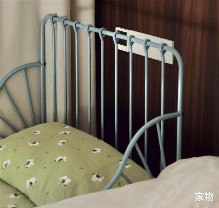 价格我记得是四百多,床身尺寸可以加长,日常用80*200厘米刚好合适,放在主卧床边既方便照看孩子,又不会占用太多的空间,更不用说这蓝灰色的铁艺架子,简直美到了我的心头上。