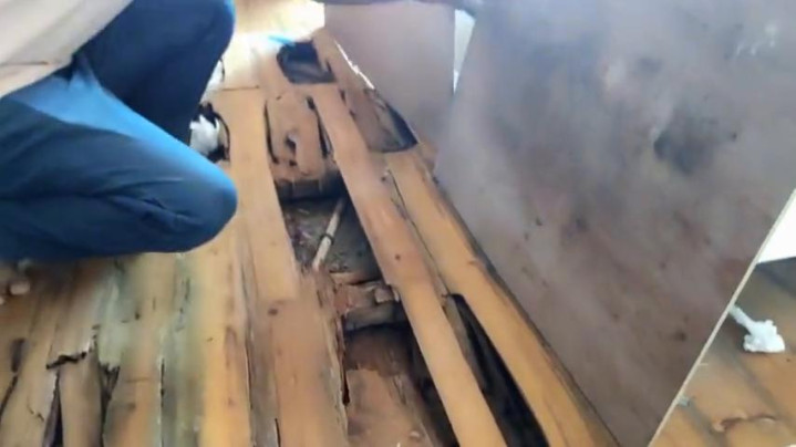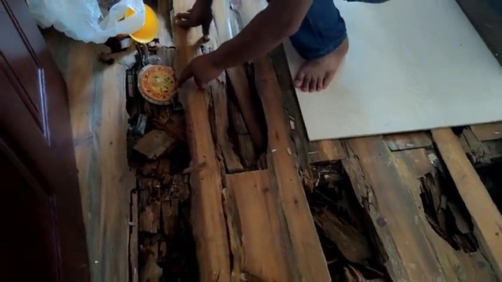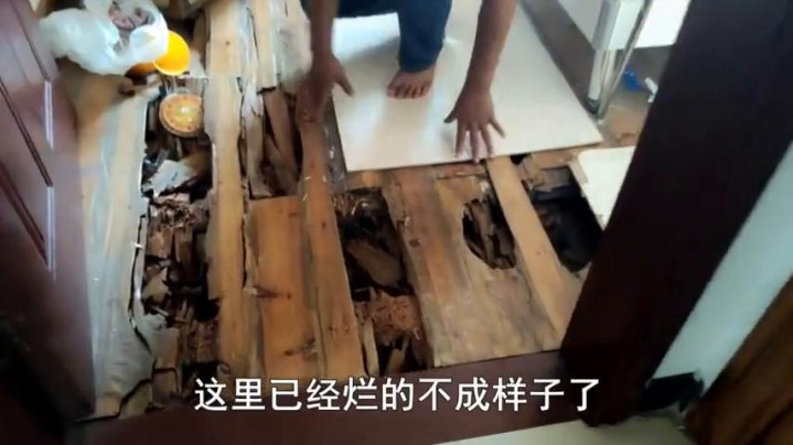 刚才那个是小孩睡的体积比较轻一点,米兰体育官方网站所以烂的就没有那么严重,因为他们要睡觉,这里是必经之路,所以用一些木板把这里盖住了。打开来给大家看一下,其实这个地方也烂的很厉害的。原来我们以为会不会太潮湿了,因为这里有一条水管,以为是因为水管潮湿的问题引起的。但是仔细看一下这个水管,除了旧一点之外,旁边的有一些泥巴之类的,一点点潮湿都没有,说明这个跟潮湿应该问题不大。