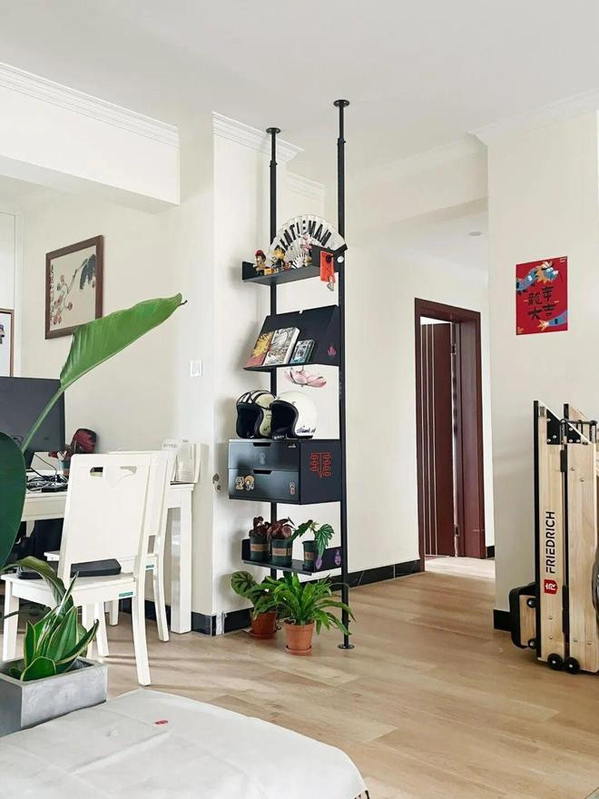 最后综合空间尺寸,在不影响过人的情况下,定制了一组顶天立地置物架,安装在过道入口处。