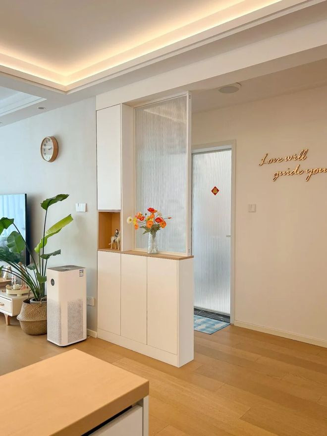网友@清清子:装修最满意的地方,就是这块油画玻璃隔断了,在遮挡卫生间的同时,也为入户造了一个美美的小景。