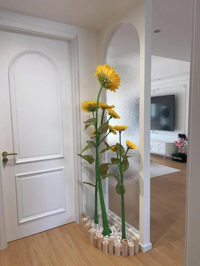 拱形框是找木工师傅做的,油画玻璃不需要用拱形,背面用木柱+石子+仿真向日葵,做了一个小花池,太治愈了。