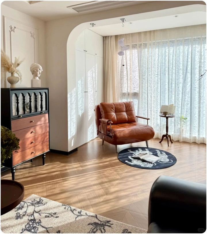 ▲木纹色作为中古风和原木风的核心,想要木地板的效果,还想要瓷砖的环保性,铺木纹砖是最完美的选择。