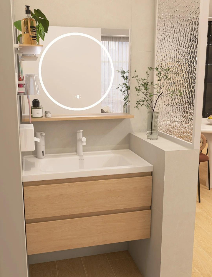 安装镜柜:这是重中之重!镜子后面藏起所有杂乱——牙膏、洗面奶、护肤品。关上门一片清净,打开门应有尽有。建议选择带开放格的镜柜,常用物品放在开放格,不常用的藏起来。
