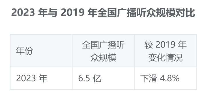 赛立信媒介研究数据显示,2023年全国广播听众规模为6.5亿,较2019年下滑4.8%。尽管车载收音机仍有稳定受众,但家用传统收音机的用户基础已持续萎缩。