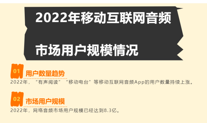 与传统收音机面临诸多问题和挑战形成鲜明对比的是,在线音频App和智能音频终端已经成为视听产业中不容小觑的新生力量。数据显示,2022年,“有声阅读”“移动电台”等移动互联网音频App的用户数量持续上涨,网络音频市场用户规模已经达到8.3亿。互联网媒体视听环境对传统收音机造成了深度冲击,其核心困境主要体现在四个方面。