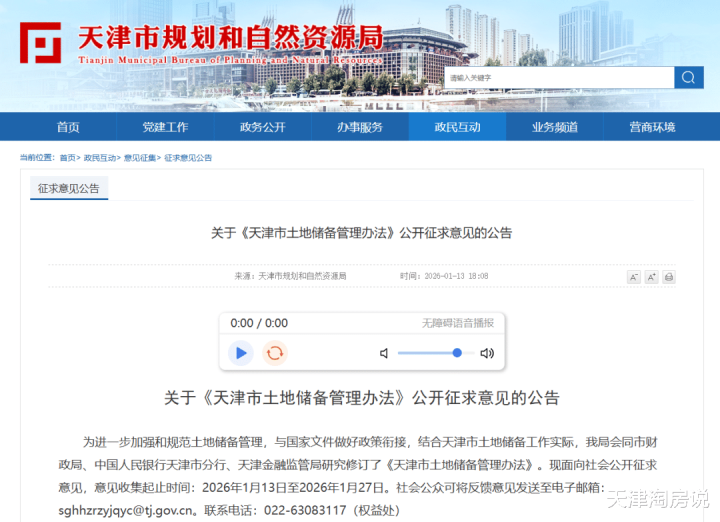 近日,天津市规划和自然资源局发布关于《天津市土地储备管理办法》公开征求意见的公告。