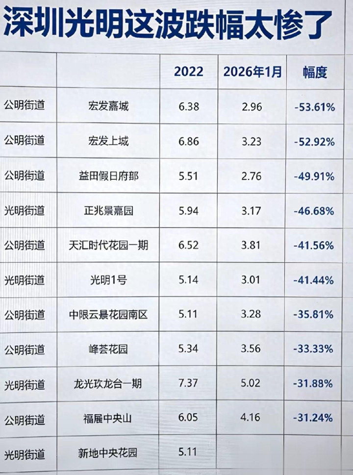 曾经一房难求的深圳光明区楼市,如今正经历深度调整,多个楼盘价格从高点大幅回落,反映出概念炒作退潮后的真实价值重估。