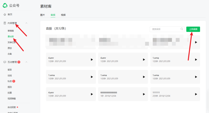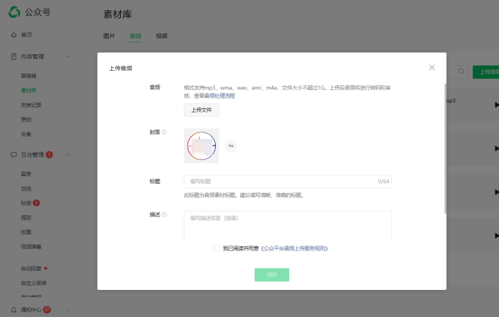 登录微信公众号后台,找到左侧菜单栏的「内容管理」,点击进入「素材库」,在素材类型中选择「音频」,随后上传本地音频文件。