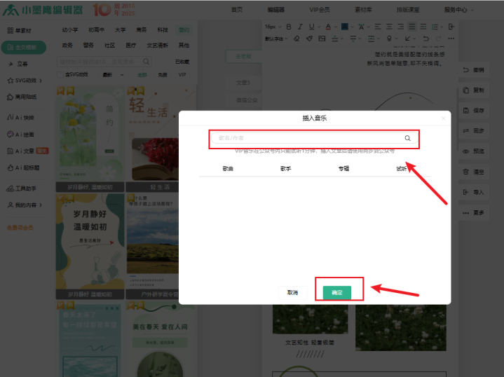 在弹窗搜索框输入关键词(比如 “治愈”“古风”“轻音乐”),米兰体育官方网站从搜索结果中选中心仪的音乐,点击「确定」,音乐播放器就会自动插入到指定位置,完成操作。