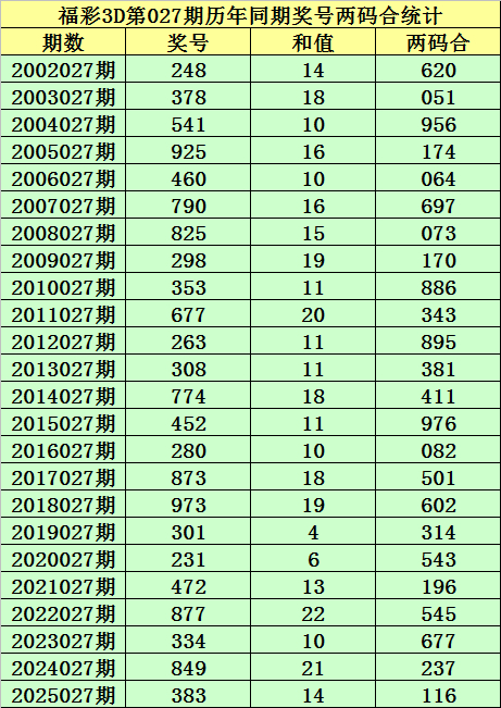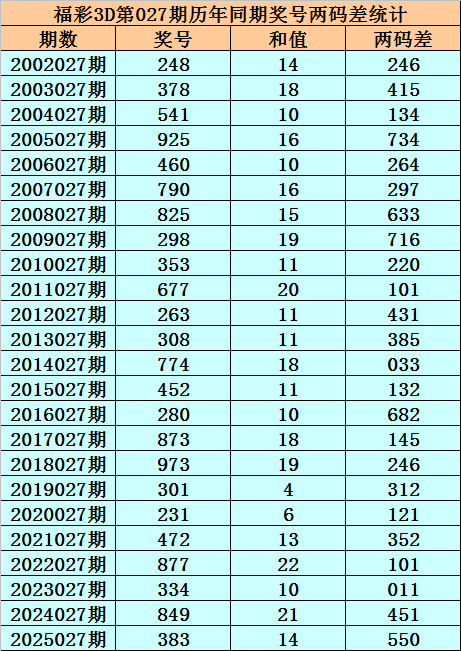 福彩3D第027期,历史上期开出24次奖号,其奖号分别为:248、378、541、925、460、790、825、298、353、677、263、308、774、452、280、873、973、301、231、472、877、334、849、383,奖号两码合差分别开出: