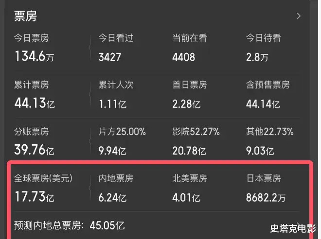 内地总票房是44.13亿,占据了最大的票仓,北美的票房也不错,有4亿多美元。