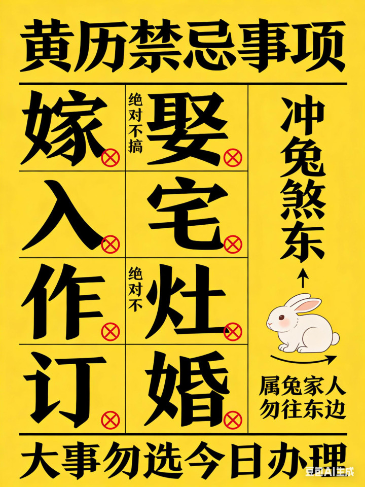 禁忌先记牢:嫁娶、入宅、作灶、订婚绝对不搞,冲兔煞东,属兔的家人别往东边跑,大事也别选这天办。