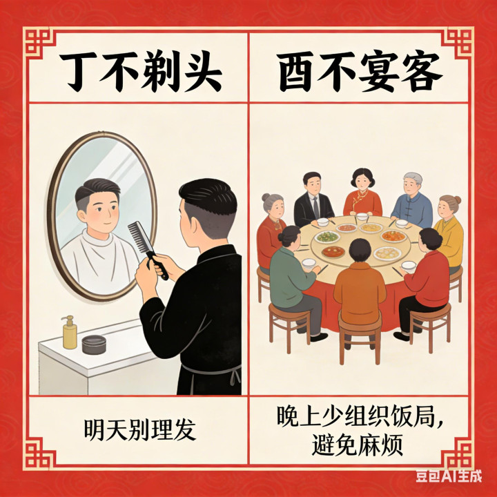 特殊禁忌别忽视:丁不剃头,明天别理发;酉不宴客,晚上少组织饭局,避免麻烦。