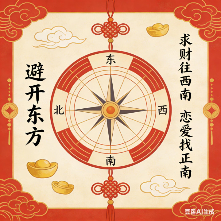 方位避开东方,求财往西南、恋爱找正南,图个好彩头。