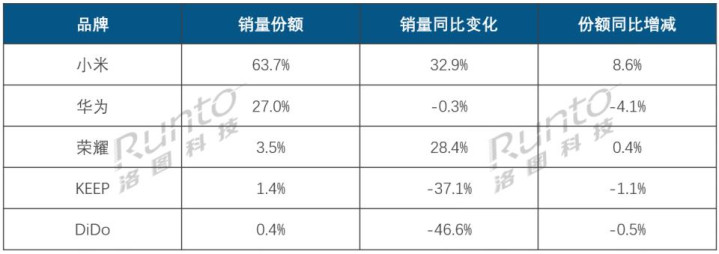 往日的2025年国内智妙手环线上销量达到1229、8万台,同比增长14.9%,销售额高达37.7亿元,同比增长25.8%,平均售价为307元。其中小米以63.7%的份额排行第一位,同比增长32.9%,份额还加多了8.6个百分点。华为以27.0%的份额排行第二位,同比下降0.3%,份额减少4.1%。荣耀以3.5%的份额排行第三位,同比增长28.4%,份额加多0.4%。后两位环球不老练,一王人同比鄙人跌。在这里环球要看护一个细节,那便是小米+华为的份额高达90.7%,同比2024年加多了4.5个百分点。换言之其它统共品牌以致连10%的份额都分不到了。