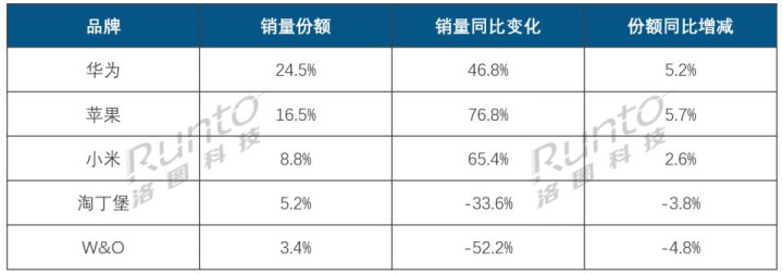 发达还从这三个品类启航,给出了细分数据。咱们来望望2025年线上成东谈主智妙腕表的排行,发达露出2025年国内成东谈主智妙腕表线上销量为2134.1万台,同比增长15.6%。销售额为244.8亿元,同比增长50.8%,平均售价达到1147元。排行前五的品牌占全体市集份额的58.4%,同比增长4.9个百分点。这说聪敏妙腕表头部效应越来越昭彰,二三线品牌照旧莫得若干契机了。其中华为以24.5%的份额排行第一位,同比增长高达46.8%,同比份额加多5.2个百分点。苹果以16.5%的份额排行第二位,同比增长76.8%,份额加多5.7个百分点。小米以8.8%的份额排行第三位,同比增长65.4%,份额加多2.6个百分点。剩下的两名环球不何如老练,在此就不逐一胪列了。成心念念的是前三名同比都在增长,但后两位同比却鄙人跌,且着落幅度超越大。