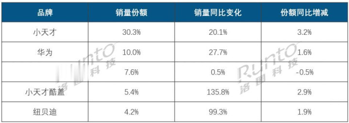 在儿童智妙腕表这个鸿沟,2025年国内线上销量为1122.4万台,同比增长7.5%。销售额达到57.2亿元,同比增长23.8%,平均售价为510元。其中小天才以30.3%的份额排行第一位,米兰同比增长20.1%,份额加多3.2个百分点。华为以10.0%的份额排行第二位,同比增长27.7%,份额加多1.6个百分点。小米米兔以7.6%的份额排行第三位,同比增长0.5%,但份额减少了0.5个百分点。小天才酷盖以5.4%的份额排行第四位,同比增长135.8%,份额加多2.9个百分点。纽贝迪以4.2%的份额排行第五位,同比增长99.3%。