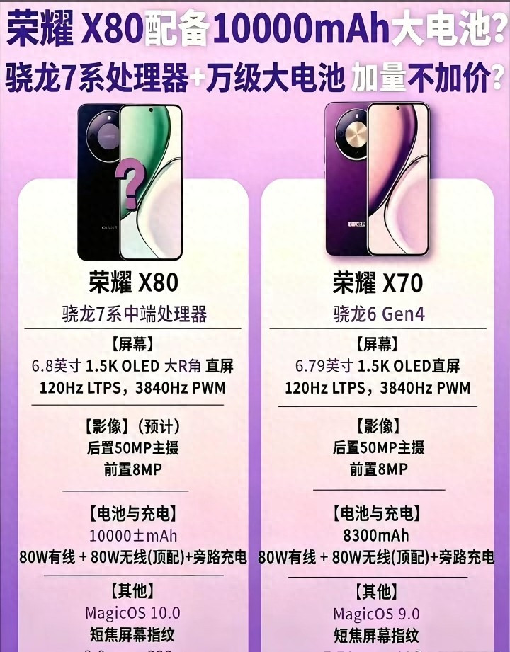 milan 荣耀X80对比X70建立对比图已发: 比拟上一代电板栽种到10000mAh。