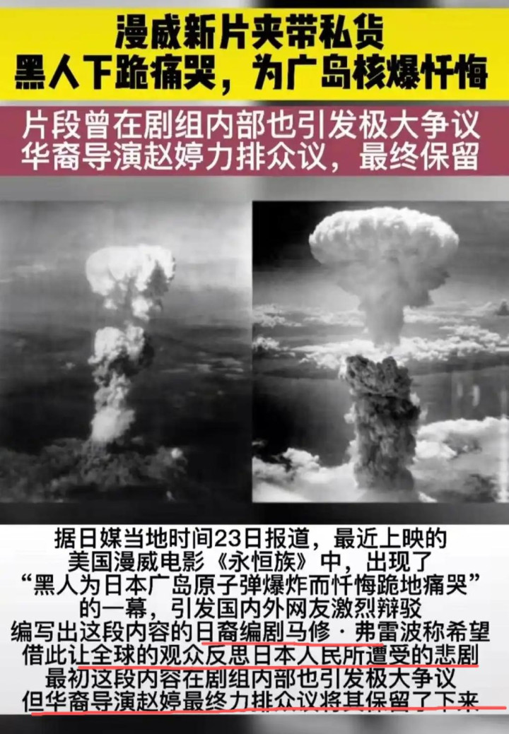 赵婷执导的《永恒族》中,有一段日裔编剧要求的情节,希望让全球观众反思 “日本人民在战争中遭受的悲剧”。