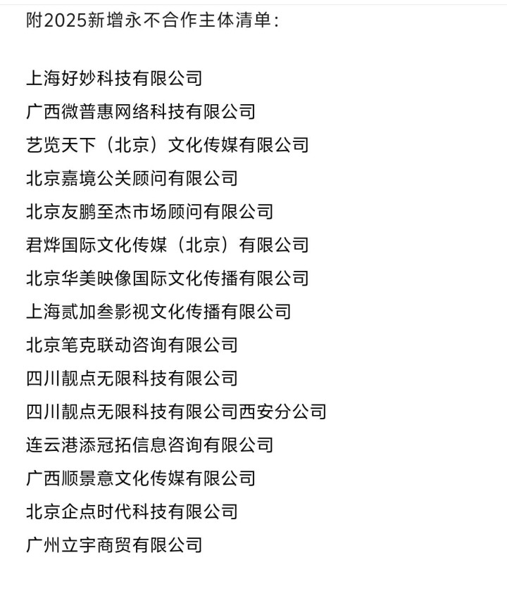 尽管姜莹莹长期合作西嘻影业,且网传其与创始人杨晓培关系密切,但腾讯通报明确违规属个人行为,未将西嘻影业列入黑名单。外部公司法人刘元迪与姜莹莹关系密切,网传为闺蜜,但通报未说明其法律后果。